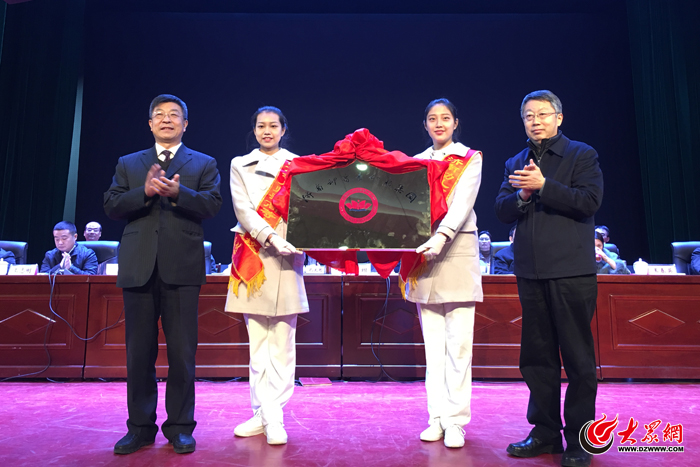山東省教育廳副廳長王坦和濟南幼兒師范高等專科學校黨委書記黃祖杰為濟南幼高專幼教集團揭牌。