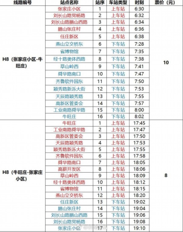 H8從張家莊小區(qū)至牛旺莊,票價10元;