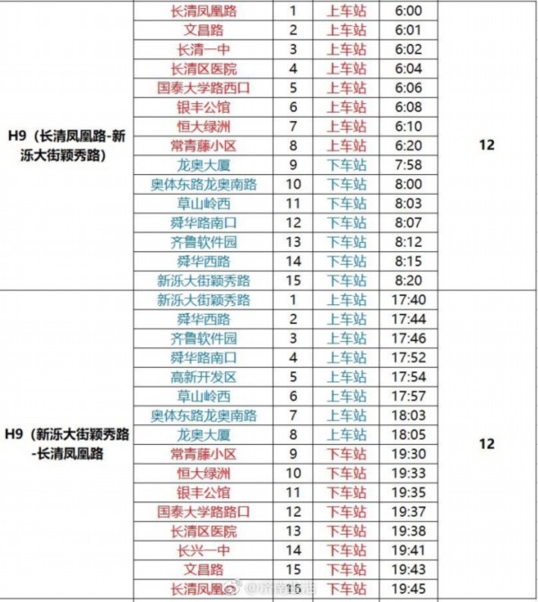 H9從長清鳳凰路至新濼大街穎秀路,票價12元;