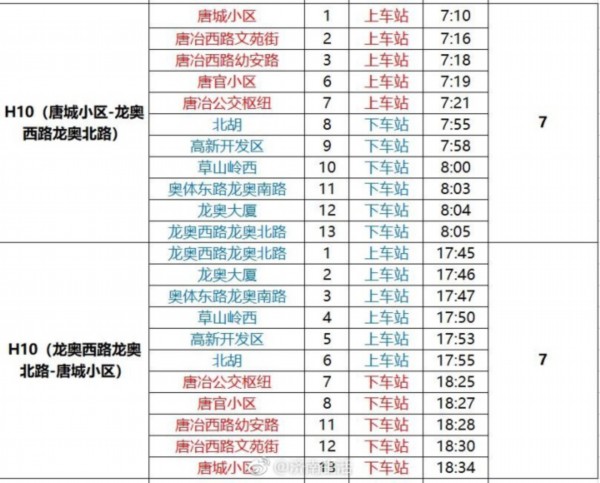 H10從唐城小區(qū)至龍奧西路龍奧北路,票價7元;