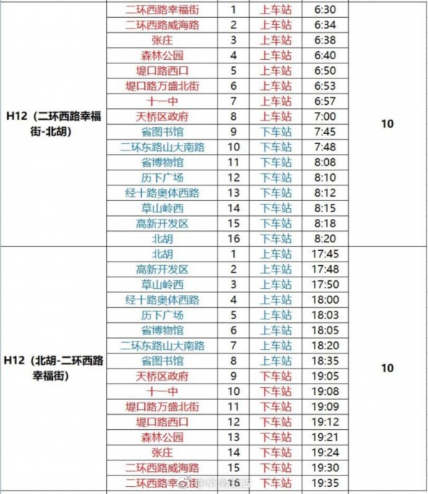 H12從二環(huán)西路幸福街至北胡,票價10元;
