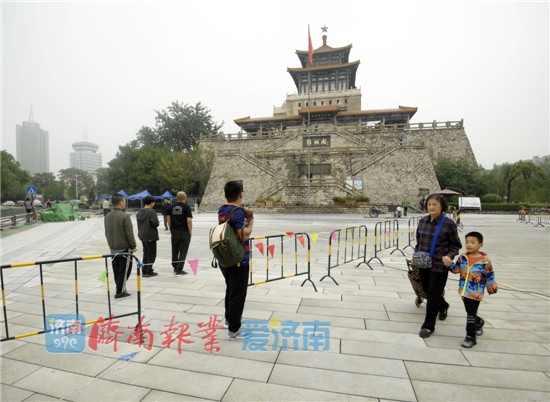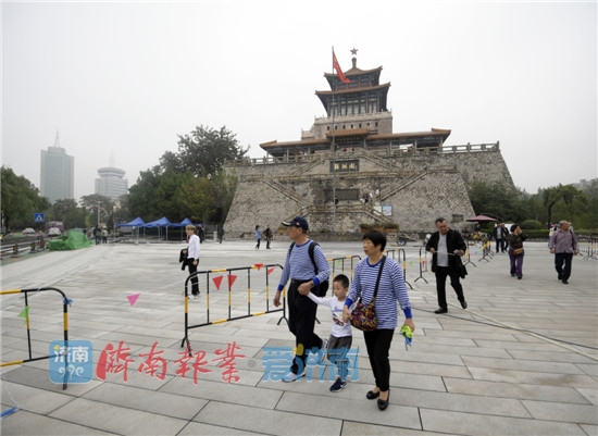9月20日,解放閣西側前廣場改造基本成型,目前已辟出專用通道供游人通行。據了解,經過一個多月的封閉改造,解放閣西側前廣場原來的瀝青路面全部鏟除,重新鋪裝上了大理石地面,總鋪裝面積達到2000多平方米。廣場綠化帶也進行了改造,種植了塔松、元寶楓等植被,面積達到200多平方米。