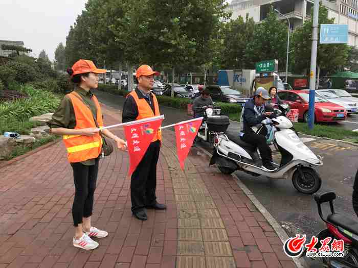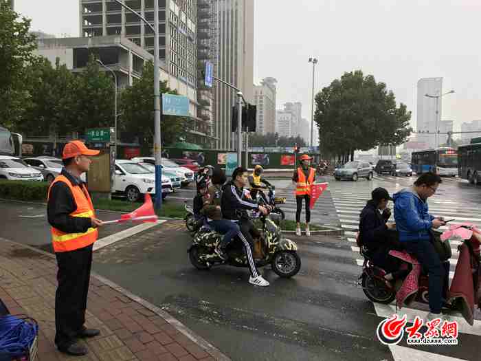 活動當日,雖天公不作美,連日的秋雨讓天空變得陰雨蒙蒙,志愿者們的服務熱情卻絲毫沒有減弱。當時正值下班高峰期,為更好的梳理交通,4名志愿者分成2組,東、西路口各1組,在斑馬線處組成一條紅色的“安全線”,紅燈亮起時伸臂揮旗,綠燈亮起時落旗放行,引導行人和非機動車遵守交通規則,及時向行動不便的孕婦、需要幫助的路人伸出援助之手,他們用熱情和耐心展示人民警察風采,用實際行動踐行著“奉獻、友愛、互助、進步”的志愿服務精神和責任擔當,為建設平安泉城做出了貢獻,繪寫了洪山路口最美風景線。