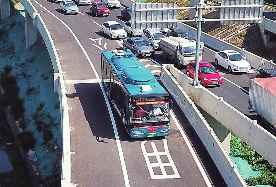 公交車在高架橋上行駛。 本報記者 崔健 攝