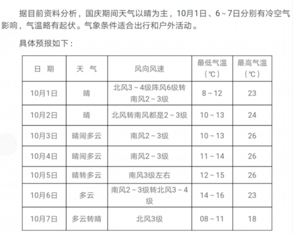 10月1日晴,北風3~4級陣風6級轉南風2~3級,最低氣溫濟陽、商河8℃左右,市區及其他區縣10~12℃,最高氣溫23℃左右;