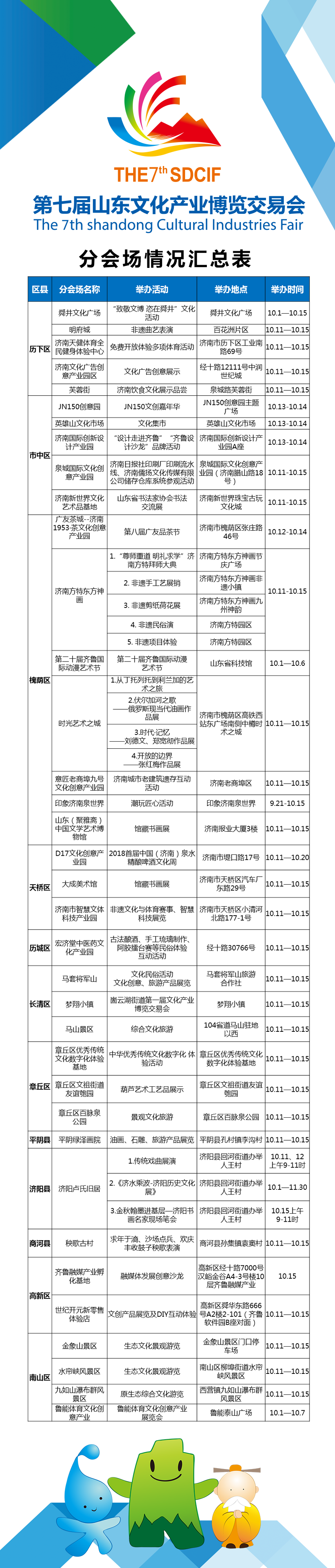 10月11日至15日,第七屆山東文博會將在高新區國際會展中心舉辦。為踐行“文化的盛會 人民的節日”的辦會宗旨,作為東道主的濟南市在名府城、百花洲、英雄山文化市場等全市各地設立了36個分會場。在文博會舉辦期間,各分會場圍繞“新時代 新動能 新創意 新發展”的文博會主題,組織開展豐富多彩的文化展示、展演等活動,讓群眾家門口享受文化的饕餮盛宴。
